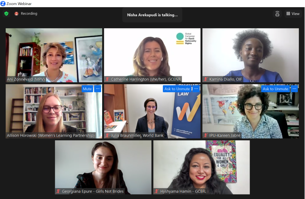 Catherine Harrington of the Global Campaign for Equal Nationality Rights (GCENR) outlined progress made in several countries, highlighted the activism of women in Malaysia affected by discriminatory nationality laws, and noted that remaining discrimination in nationality laws “creates unnecessary suffering”. Hyshyama Hamin of the Global Campaign for Equality in Family Law (GCEFL) spoke about the Coalition’s achievements and noted how “important it is to ground activism nationally, regionally, and globally in the lived realities of how discriminatory family laws and practices impact women and girls…and that those most affected by the discriminatory laws and practices are the ones who lead the call for reforms.” She also recognized that these laws are among the slowest and most challenging to amend, repeal or codify because often culture and religion are used as a basis to keep these laws in their discriminatory state. The discussion closed on a hopeful note as panelists shared their strategies for continuing to hold governments accountable going forward.